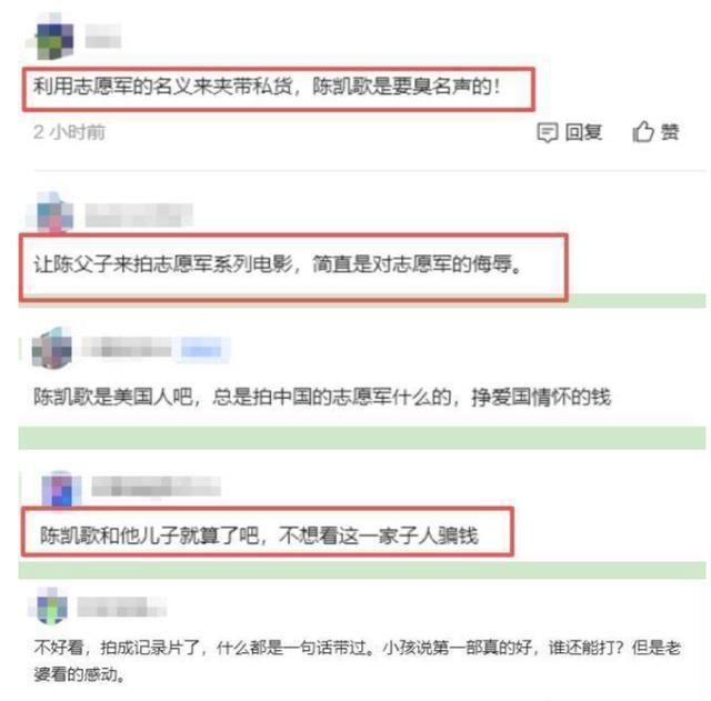 但陈凯歌怕是根本就没有这么想过,他还是想向从前那样为儿子倾斜资源。 这么做的结果大家都已经看到了,《志愿军3》变成了《陈飞宇英雄传》, 一部本该思考战争、致敬英烈的电影作品,成了陈凯歌力捧儿子的“工具”。